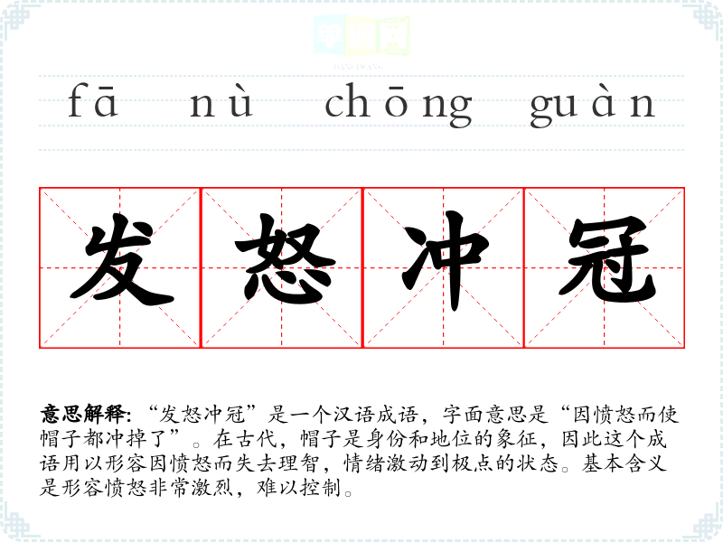 “发怒冲冠”出自唐代文学家杜甫的《兵车行》。其中描述了百姓因战乱而愤怒不已的场景,表明了在面对极端不公或痛苦时,人们的愤怒可以达到一种失控的状态。该成语的历史背景反映了古代社会动荡与民生困苦所引发的强烈情感。