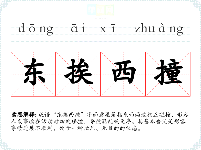 成语“东挨西撞”字面意思是指东西两边相互碰撞,形容人或事物在活动时四处碰撞,导致混乱或无序。其基本含义是形容事情进展不顺利,处于一种忙乱、无目的的状态。