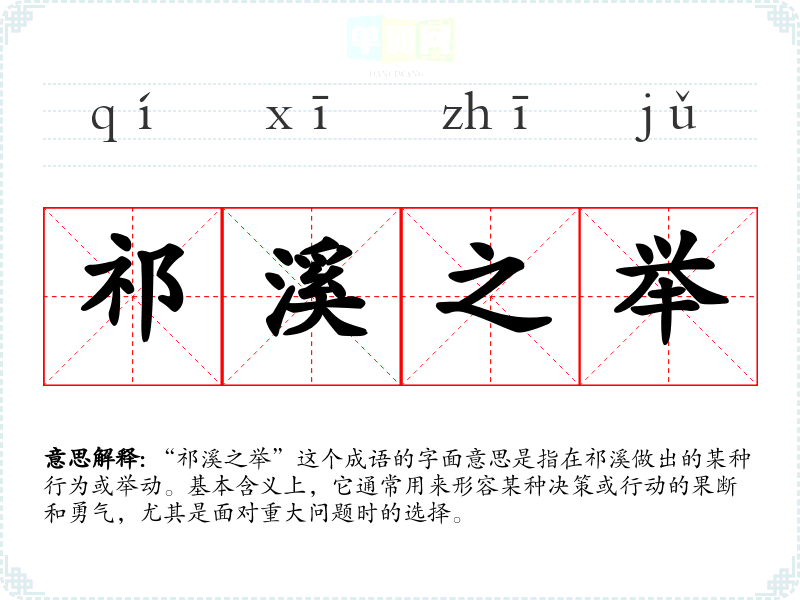 “祁溪之举”这个成语的字面意思是指在祁溪做出的某种行为或举动。基本含义上,它通常用来形容某种决策或行动的果断和勇气,尤其是面对重大问题时的选择。