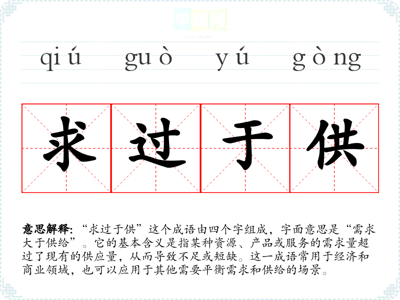 “求过于供”这个成语由四个字组成,字面意思是“需求大于供给”。它的基本含义是指某种资源、产品或服务的需求量超过了现有的供应量,从而导致不足或短缺。这一成语常用于经济和商业领域,也可以应用于其他需要平衡需求和供给的场景。