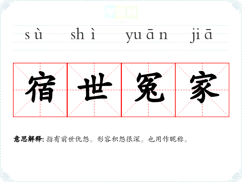 | 宿世冤家 | 指有前世仇怨。形容积怨很深。也用作昵称。 |