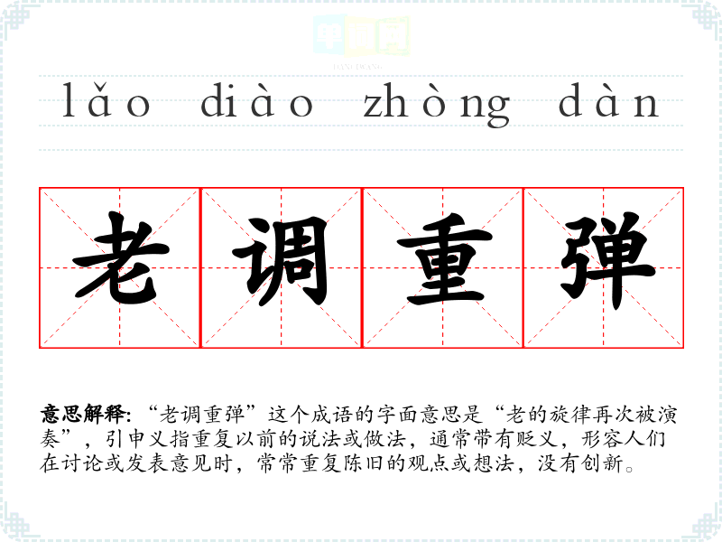 “老调重弹”这个成语的字面意思是“老的旋律再次被演奏”,引申义指重复以前的说法或做法,通常带有贬义,形容人们在讨论或发表意见时,常常重复陈旧的观点或想法,没有创新。