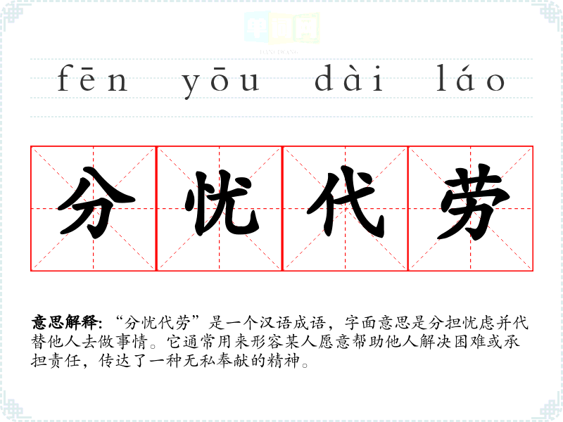 “分忧代劳”是一个汉语成语,字面意思是分担忧虑并代替他人去做事情。它通常用来形容某人愿意帮助他人解决困难或承担责任,传达了一种无私奉献的精神。