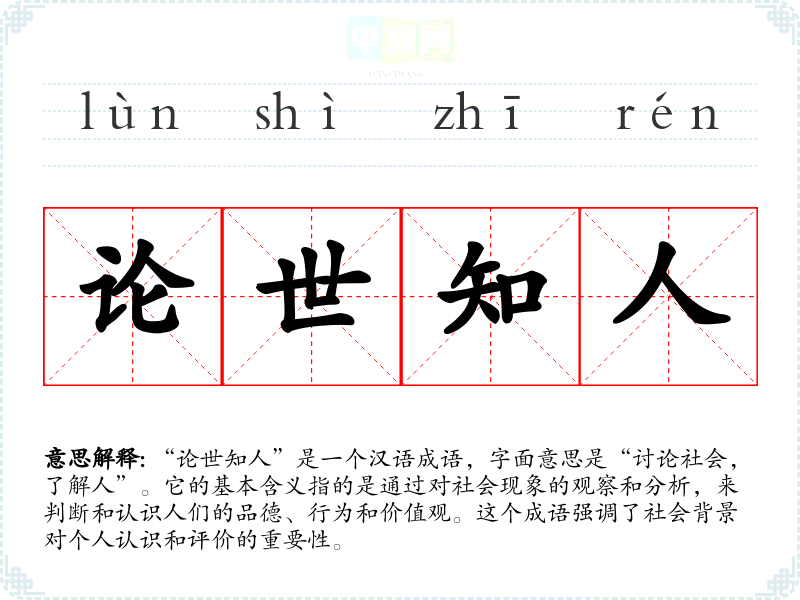 “论世知人”是一个汉语成语,字面意思是“讨论社会,了解人”。它的基本含义指的是通过对社会现象的观察和分析,来判断和认识人们的品德、行为和价值观。这个成语强调了社会背景对个人认识和评价的重要性。