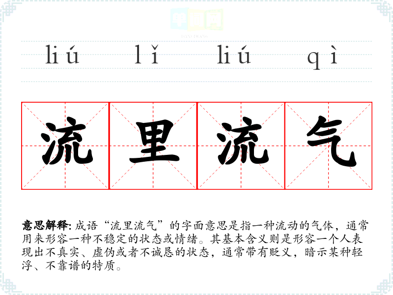 成语“流里流气”的字面意思是指一种流动的气体,通常用来形容一种不稳定的状态或情绪。其基本含义则是形容一个人表现出不真实、虚伪或者不诚恳的状态,通常带有贬义,暗示某种轻浮、不靠谱的特质。