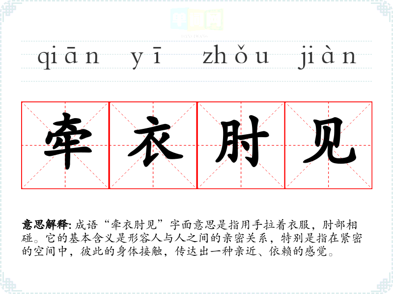 成语“牵衣肘见”字面意思是指用手拉着衣服,肘部相碰。它的基本含义是形容人与人之间的亲密关系,特别是指在紧密的空间中,彼此的身体接触,传达出一种亲近、依赖的感觉。
