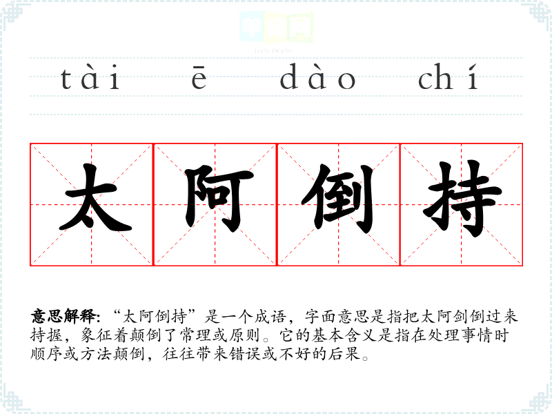 “太阿倒持”是一个成语,字面意思是指把太阿剑倒过来持握,象征着颠倒了常理或原则。它的基本含义是指在处理事情时顺序或方法颠倒,往往带来错误或不好的后果。