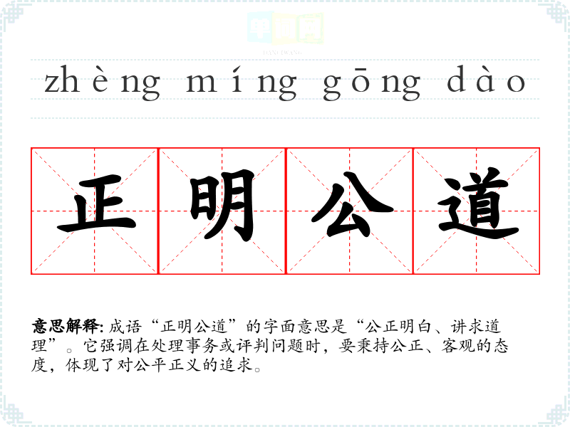 成语“正明公道”的字面意思是“公正明白、讲求道理”。它强调在处理事务或评判问题时,要秉持公正、客观的态度,体现了对公平正义的追求。
