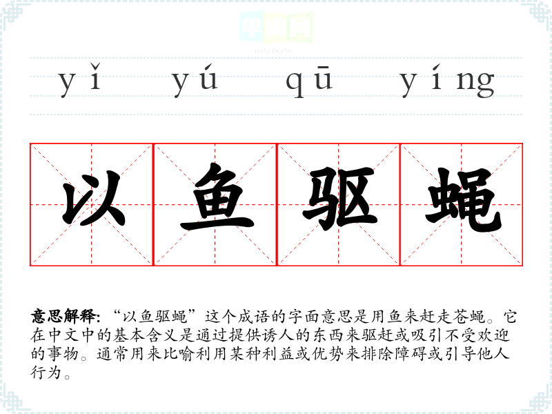 “以鱼驱蝇”这个成语的字面意思是用鱼来赶走苍蝇。它在中文中的基本含义是通过提供诱人的东西来驱赶或吸引不受欢迎的事物。通常用来比喻利用某种利益或优势来排除障碍或引导他人行为。