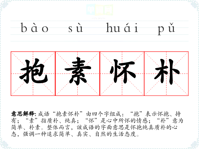 成语“抱素怀朴”由四个字组成:“抱”表示怀抱、持有;“素”指质朴、纯真;“怀”是心中所怀的情感;“朴”意为简单、朴素。整体而言,该成语的字面意思是怀抱纯真质朴的心态,强调一种追求简单、真实、自然的生活态度。