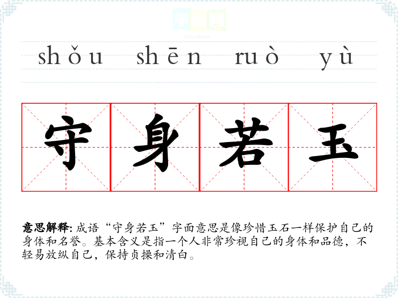 成语“守身若玉”字面意思是像珍惜玉石一样保护自己的身体和名誉。基本含义是指一个人非常珍视自己的身体和品德,不轻易放纵自己,保持贞操和清白。