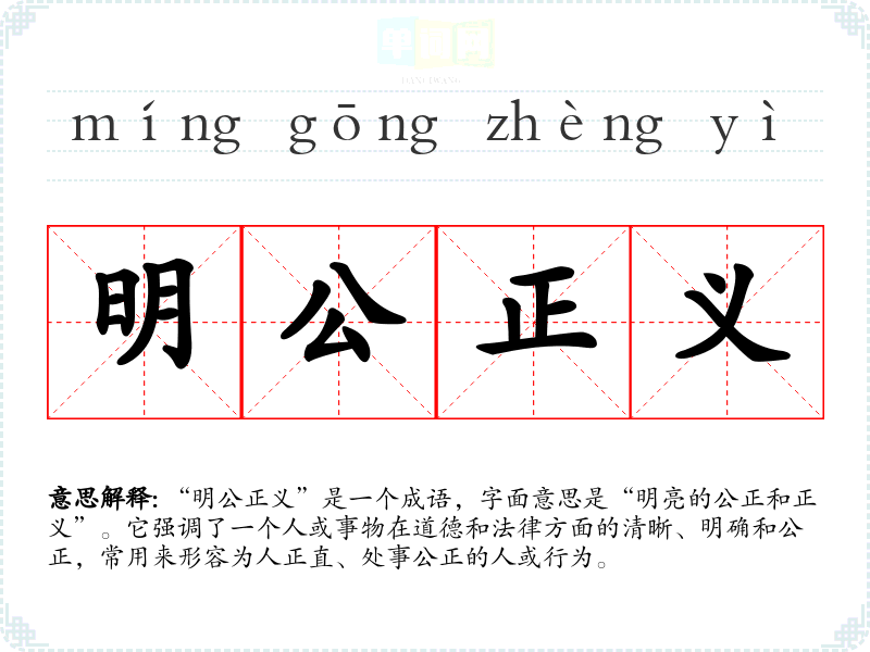 “明公正义”是一个成语,字面意思是“明亮的公正和正义”。它强调了一个人或事物在道德和法律方面的清晰、明确和公正,常用来形容为人正直、处事公正的人或行为。