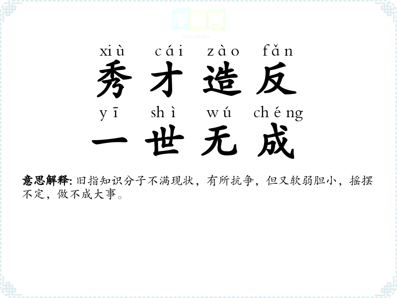 | 秀才造反,一世无成 | 旧指知识分子不满现状,有所抗争,但又软弱胆小,摇摆不定,做不成大事。 |