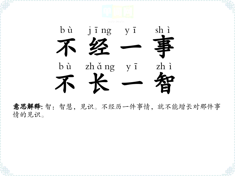 | 不经一事,不长一智 | 智:智慧,见识。不经历一件事情,就不能增长对那件事情的见识。 |