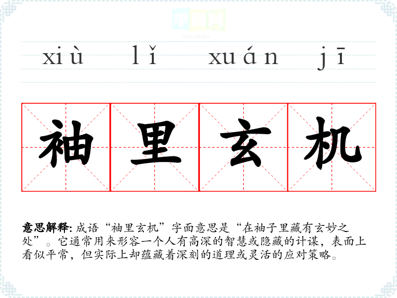 成语“袖里玄机”字面意思是“在袖子里藏有玄妙之处”。它通常用来形容一个人有高深的智慧或隐藏的计谋,表面上看似平常,但实际上却蕴藏着深刻的道理或灵活的应对策略。