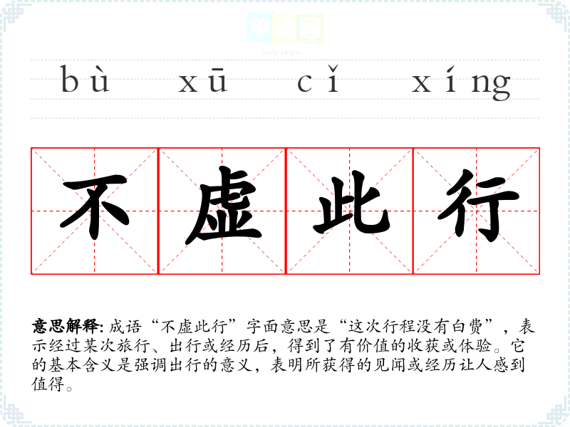 成语“不虚此行”字面意思是“这次行程没有白费”,表示经过某次旅行、出行或经历后,得到了有价值的收获或体验。它的基本含义是强调出行的意义,表明所获得的见闻或经历让人感到值得。