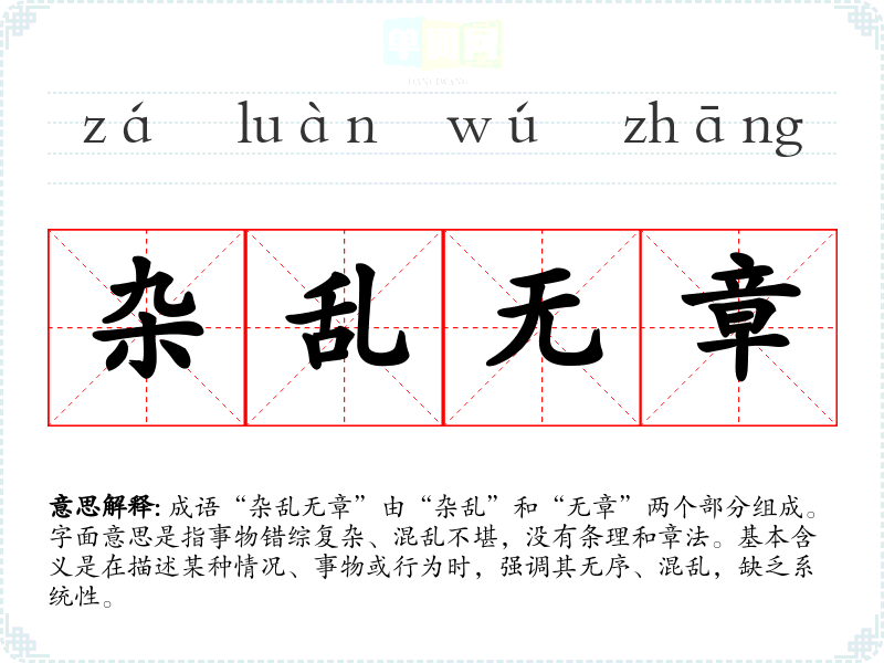 成语“杂乱无章”由“杂乱”和“无章”两个部分组成。字面意思是指事物错综复杂、混乱不堪,没有条理和章法。基本含义是在描述某种情况、事物或行为时,强调其无序、混乱,缺乏系统性。