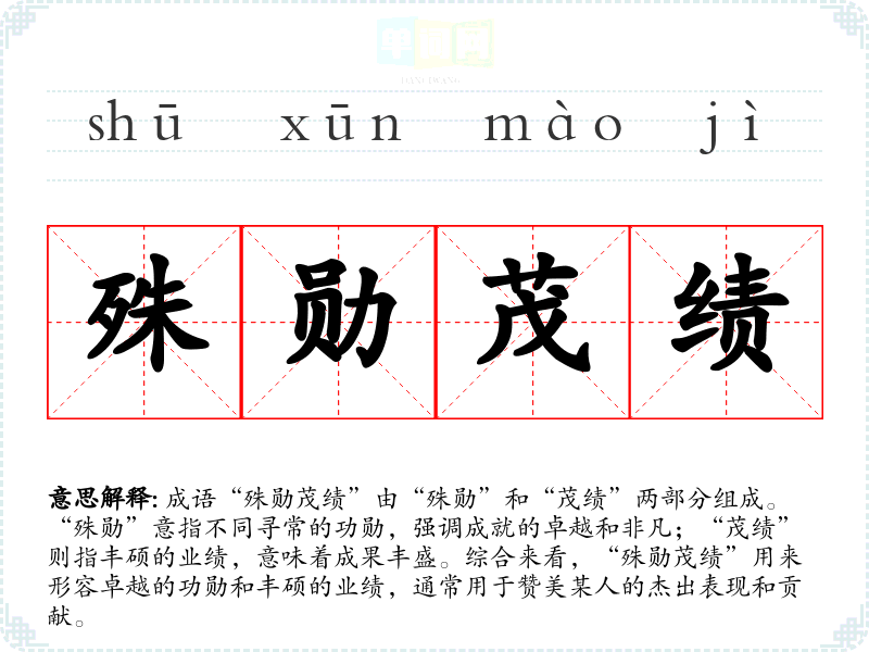 成语“殊勋茂绩”由“殊勋”和“茂绩”两部分组成。“殊勋”意指不同寻常的功勋,强调成就的卓越和非凡;“茂绩”则指丰硕的业绩,意味着成果丰盛。综合来看,“殊勋茂绩”用来形容卓越的功勋和丰硕的业绩,通常用于赞美某人的杰出表现和贡献。