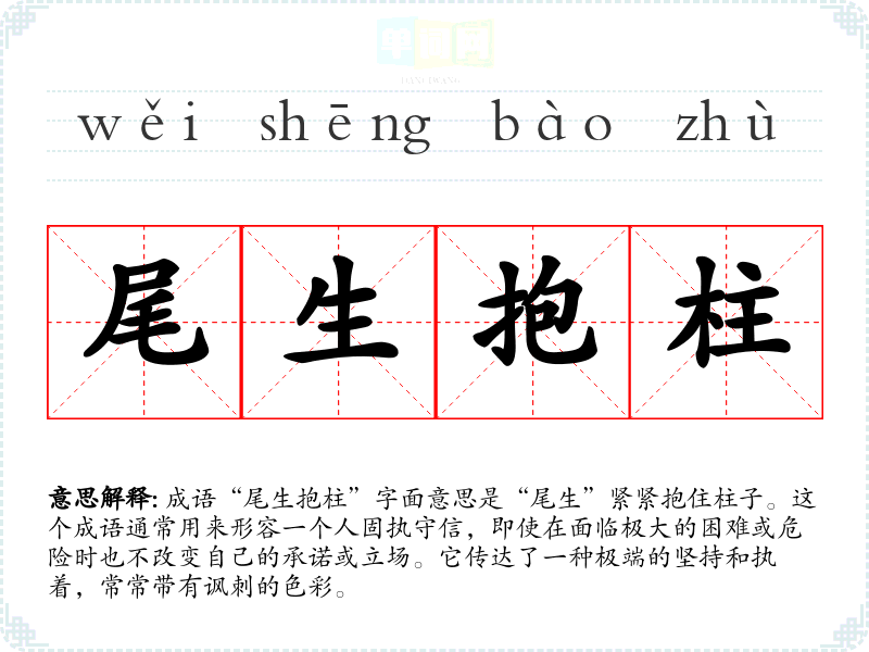 成语“尾生抱柱”字面意思是“尾生”紧紧抱住柱子。这个成语通常用来形容一个人固执守信,即使在面临极大的困难或危险时也不改变自己的承诺或立场。它传达了一种极端的坚持和执着,常常带有讽刺的色彩。