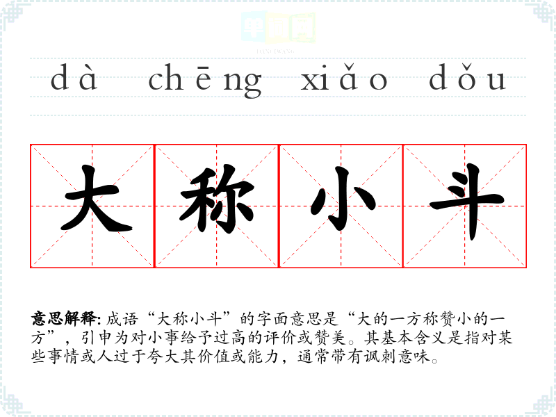 成语“大称小斗”的字面意思是“大的一方称赞小的一方”,引申为对小事给予过高的评价或赞美。其基本含义是指对某些事情或人过于夸大其价值或能力,通常带有讽刺意味。