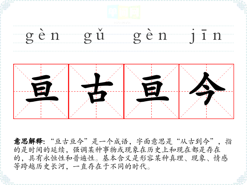 “亘古亘今”是一个成语,字面意思是“从古到今”,指的是时间的延续,强调某种事物或现象在历史上和现在都是存在的,具有永恒性和普遍性。基本含义是形容某种真理、现象、情感等跨越历史长河,一直存在于不同的时代。