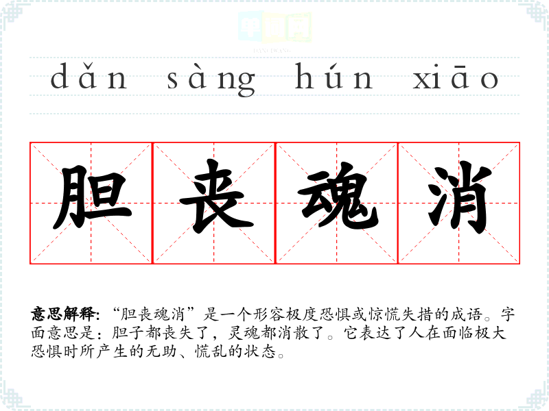 | 胆丧魂消 | 形容极度害怕、恐慌。 |