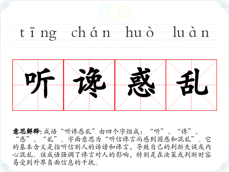 成语“听谗惑乱”由四个字组成:“听”、“谗”、“惑”、“乱”。字面意思为“听信谗言而感到困惑和混乱”。它的基本含义是指听信别人的诽谤和谗言,导致自己的判断失误或内心混乱。该成语强调了谗言对人的影响,特别是在决策或判断时容易受到外界负面信息的干扰。