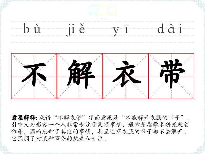 成语“不解衣带”字面意思是“不能解开衣服的带子”。引申义为形容一个人非常专注于某项事情,通常是指学术研究或创作等,因而忘却了其他的事情,甚至连穿衣服的带子都不去解开。它强调了对某种事务的执着和专注。