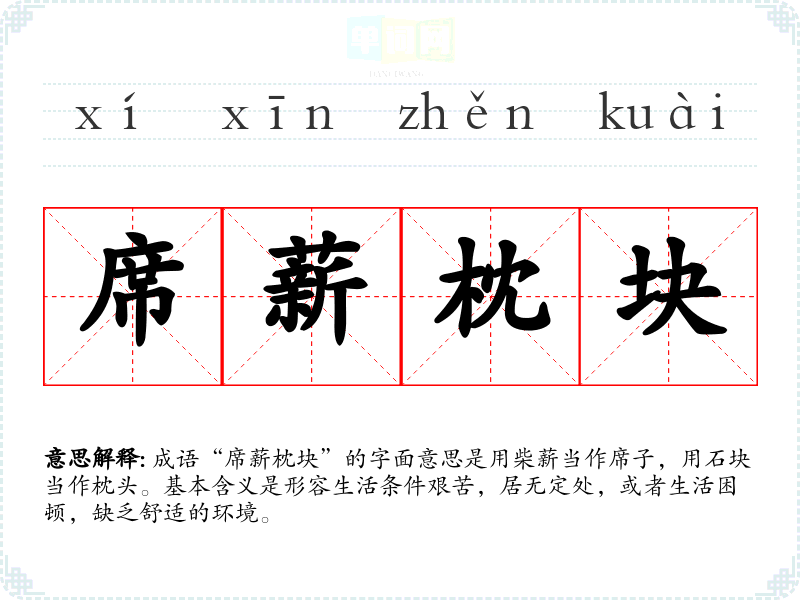 成语“席薪枕块”的字面意思是用柴薪当作席子,用石块当作枕头。基本含义是形容生活条件艰苦,居无定处,或者生活困顿,缺乏舒适的环境。