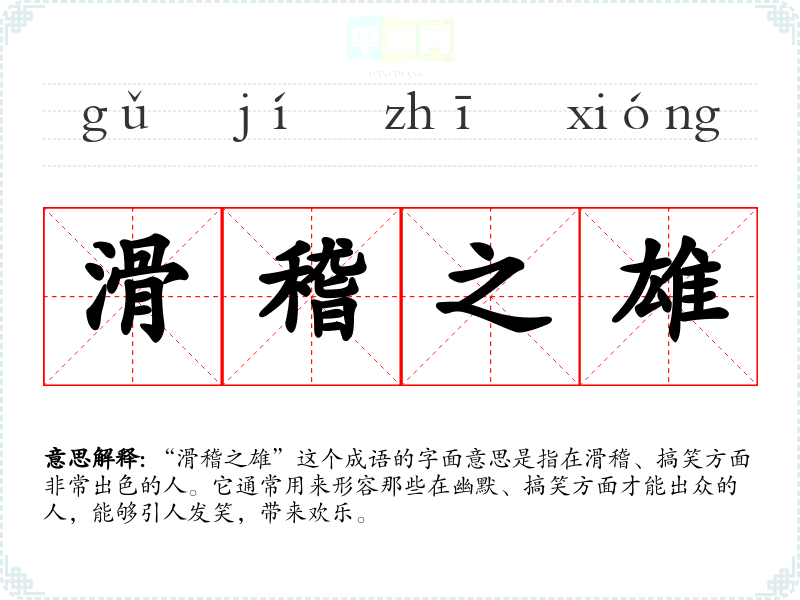 “滑稽之雄”这个成语的字面意思是指在滑稽、搞笑方面非常出色的人。它通常用来形容那些在幽默、搞笑方面才能出众的人,能够引人发笑,带来欢乐。