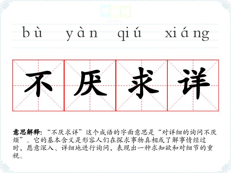 “不厌求详”这个成语的字面意思是“对详细的询问不厌烦”。它的基本含义是形容人们在探求事物真相或了解事情经过时,愿意深入、详细地进行询问,表现出一种求知欲和对细节的重视。