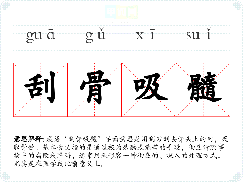 刮骨吸髓 刮开骨头来吸骨髓。比喻剥削压迫极其残酷。