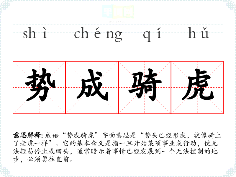 成语“势成骑虎”字面意思是“势头已经形成,就像骑上了**一样”。它的基本含义是指一旦开始某项事业或行动,便无法轻易停止或回头,通常暗示着事情已经发展到一个无法控制的地步,必须勇往直前。
