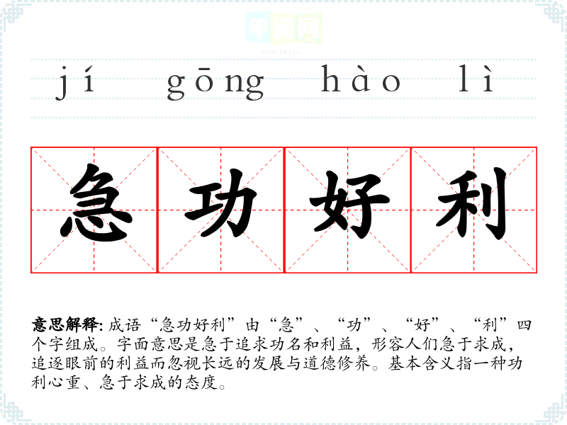 成语“急功好利”由“急”、“功”、“好”、“利”四个字组成。字面意思是急于追求功名和利益,形容人们急于求成,追逐眼前的利益而忽视长远的发展与道德修养。基本含义指一种功利心重、急于求成的态度。