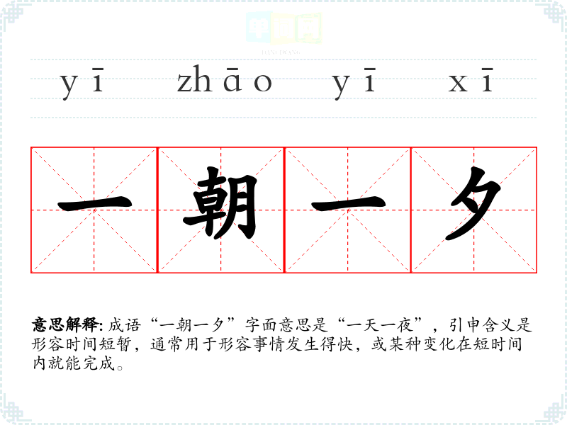 成语“一朝一夕”字面意思是“一天一夜”,引申含义是形容时间短暂,通常用于形容事情发生得快,或某种变化在短时间内就能完成。
