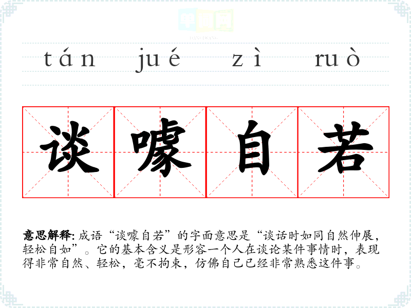 成语“谈噱自若”的字面意思是“谈话时如同自然伸展,轻松自如”。它的基本含义是形容一个人在谈论某件事情时,表现得非常自然、轻松,毫不拘束,仿佛自己已经非常熟悉这件事。