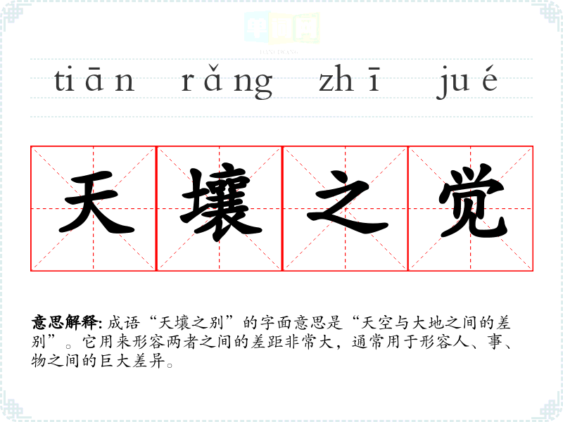 成语“天壤之别”的字面意思是“天空与大地之间的差别”。它用来形容两者之间的差距非常大,通常用于形容人、事、物之间的巨大差异。