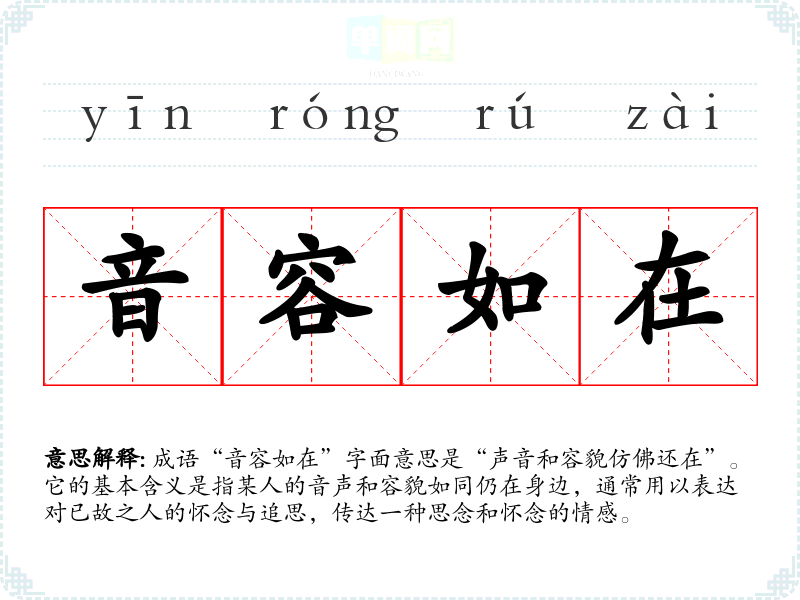 成语“音容如在”字面意思是“声音和容貌仿佛还在”。它的基本含义是指某人的音声和容貌如同仍在身边,通常用以表达对已故之人的怀念与追思,传达一种思念和怀念的情感。