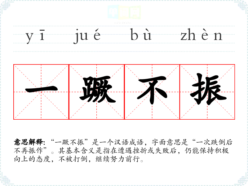 “一蹶不振”是一个汉语成语,字面意思是“一次跌倒后不再振作”。其基本含义是指在遭遇挫折或失败后,仍能保持积极向上的态度,不被打倒,继续努力前行。