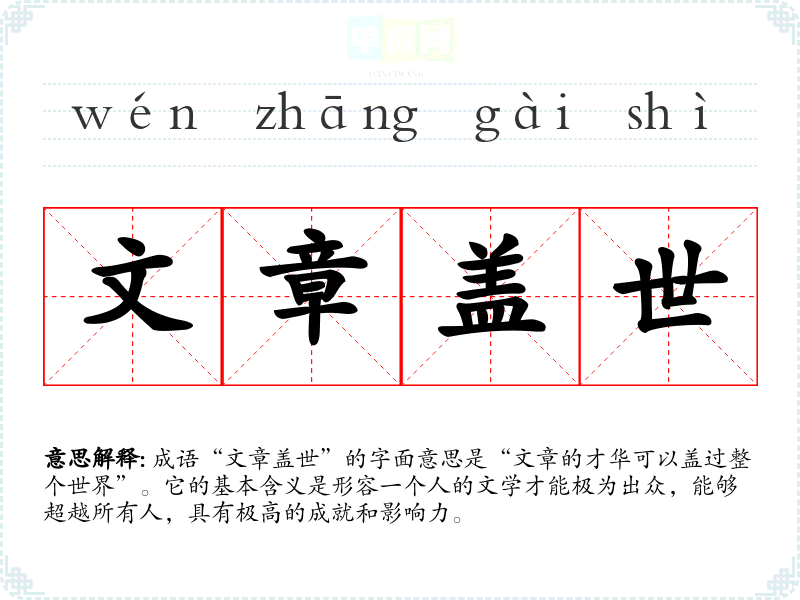 成语“文章盖世”的字面意思是“文章的才华可以盖过整个世界”。它的基本含义是形容一个人的文学才能极为出众,能够超越所有人,具有极高的成就和影响力。