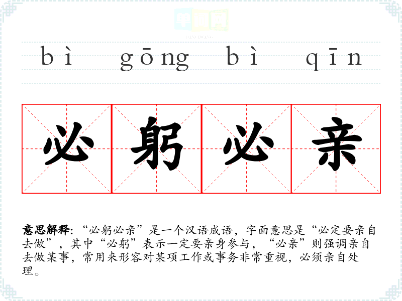 “必躬必亲”是一个汉语成语,字面意思是“必定要亲自去做”,其中“必躬”表示一定要亲身参与,“必亲”则强调亲自去做某事,常用来形容对某项工作或事务非常重视,必须亲自处理。