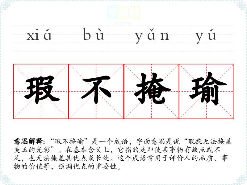 “瑕不掩瑜”是一个成语,字面意思是说“瑕疵无法掩盖美玉的光彩”。在基本含义上,它指的是即使某事物有缺点或不足,也无法掩盖其优点或长处。这个成语常用于评价人的品质、事物的价值等,强调优点的重要性。