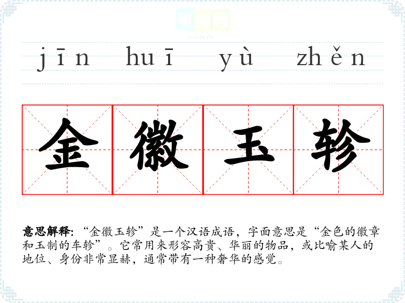 “金徽玉轸”是一个汉语成语,字面意思是“金色的徽章和玉制的车轸”。它常用来形容高贵、华丽的物品,或比喻某人的地位、身份非常显赫,通常带有一种奢华的感觉。