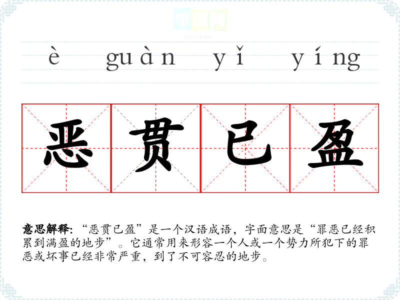 “恶贯已盈”是一个汉语成语,字面意思是“罪恶已经积累到满盈的地步”。它通常用来形容一个人或一个势力所犯下的罪恶或坏事已经非常严重,到了不可容忍的地步。