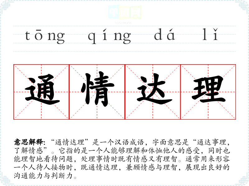 “通情达理”是一个汉语成语,字面意思是“通达事理,了解情感”。它指的是一个人能够理解和体恤他人的感受,同时也能理智地看待问题,处理事情时既有情感又有理智。通常用来形容一个人待人接物时,既通情达理,兼顾情感与理智,展现出良好的沟通能力与判断力。