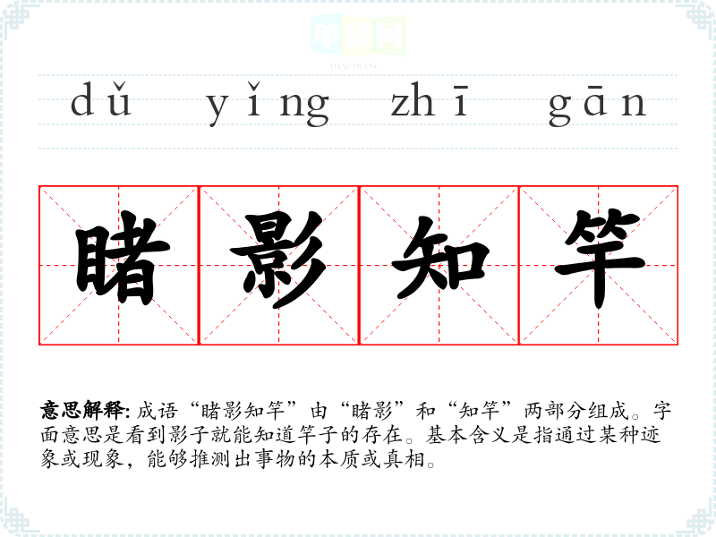 成语“睹影知竿”由“睹影”和“知竿”两部分组成。字面意思是看到影子就能知道竿子的存在。基本含义是指通过某种迹象或现象,能够推测出事物的本质或真相。