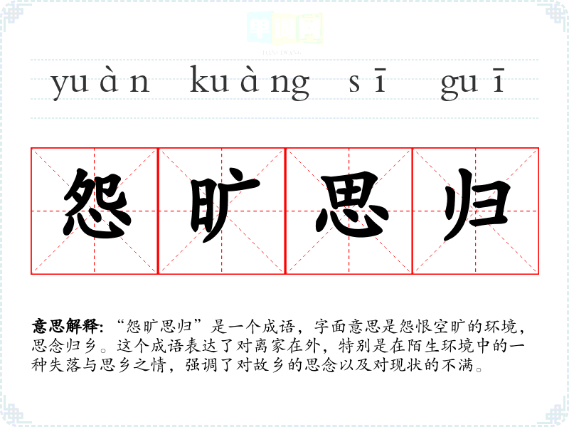 “怨旷思归”是一个成语,字面意思是怨恨空旷的环境,思念归乡。这个成语表达了对离家在外,特别是在陌生环境中的一种失落与思乡之情,强调了对故乡的思念以及对现状的不满。