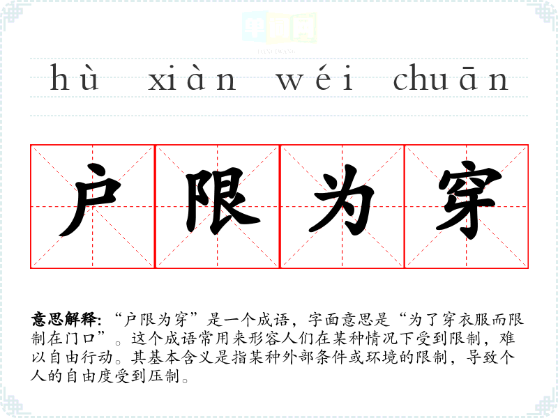 “户限为穿”这个成语的出处可以追溯到古代文学,具体的典故并不明确,但它常常被用来形容在生活或工作中,受到环境或条件的限制而无法顺利进行。它反映了古人对限制与自由之间关系的深刻理解。