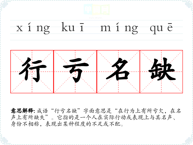 成语“行亏名缺”字面意思是“在行为上有所亏欠,在名声上有所缺失”。它指的是一个人在实际行动或表现上与其名声、身份不相称,表现出某种程度的不足或不配。
