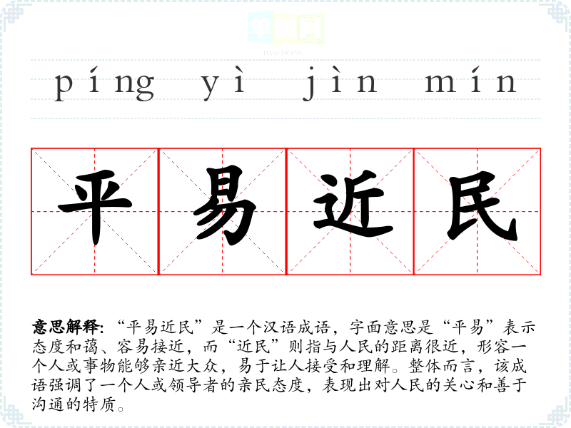 “平易近民”是一个汉语成语,字面意思是“平易”表示态度和蔼、容易接近,而“近民”则指与人民的距离很近,形容一个人或事物能够亲近大众,易于让人接受和理解。整体而言,该成语强调了一个人或领导者的亲民态度,表现出对人民的关心和善于沟通的特质。